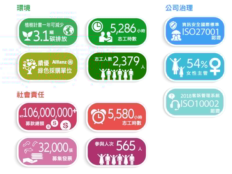 身為倡議聯合國2050年達成淨零碳排放(Net Zero)目標的全球領導企業之一,安聯集團是ESG的領航者、更是積極實踐者。台灣安聯人壽為落實達成ESG各項指標,在董事會指導下於內部建立完整執行架構,並將ESG因子納入投資政策。本公司並力行環保節能減碳措施,長年為高齡失智者慈善募款,同時以誠信經營、高度法令遵循自我要求,公司女性主管占比高達53%,堪稱壽險業表率。