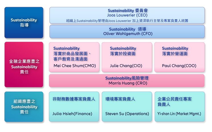 1.本公司於2021年成立ESG委員會,由董事兼總經理擔任主席,在本公司財務長領導下,指揮公司資深執行主管統籌ESG委員會運作;針對金融企業應盡之ESG責任,由投資長、行銷長、營運長分別負責落實於投資面、商品發展、客戶教育及溝通面和營運層面,風險長負責風險管理。針對組織應盡之ESG責任,分成環境、企業公民責任、非財務數據三大專案,由各專案負責人籌劃並落實執行。沃格穆指出,安聯已決心採取塑造淨零碳排放經濟之必要行動,為在2050年前達到此長期目標,安聯除率先在金融業倡導此行動,並已設定明確之里程碑進程。